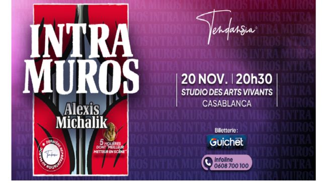 Après avoir conquis le public marocain lors de deux représentations sold out à Casablanca et Rabat, «Intra Muros», la pièce bouleversante d’Alexis Michalik, revient une dernière fois sur scène pour une dernière représentation au Maroc, le 20 novembre prochain à 20h30 au Studio des Arts Vivants de Casablanca. Produite par Tendansia, cette œuvre magistrale signée du dramaturge français couronné de cinq trophées Molières, dont «Meilleur Metteur en Scène» promet une soirée de théâtre d’une intensité rare, où émotion, humour et humanité se mêlent avec brio.