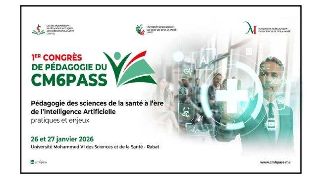 Le Centre Mohammed VI de Pédagogie Appliquée aux Sciences de la Santé (CM6PASS), relevant de la Fondation Mohammed VI des Sciences et de la Santé (FM6SS), organise les 26 et 27 janvier courant à Rabat le 1er Congrès de Pédagogie du CM6PASS, sous le thème «Pédagogie des Sciences de la Santé à l’ère de l’Intelligence Artificielle : Pratiques et enjeux». Cet événement majeur ambitionne de constituer un espace de réflexion et de partage réunissant formateurs, chercheurs, enseignants universitaires et professionnels de santé autour des mutations profondes que connaît l’enseignement des sciences de la santé.